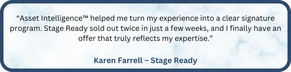 She's the co-creator of the Asset Intelligence™ Framework - the system that turns expertise into scalable, income-producing assets..